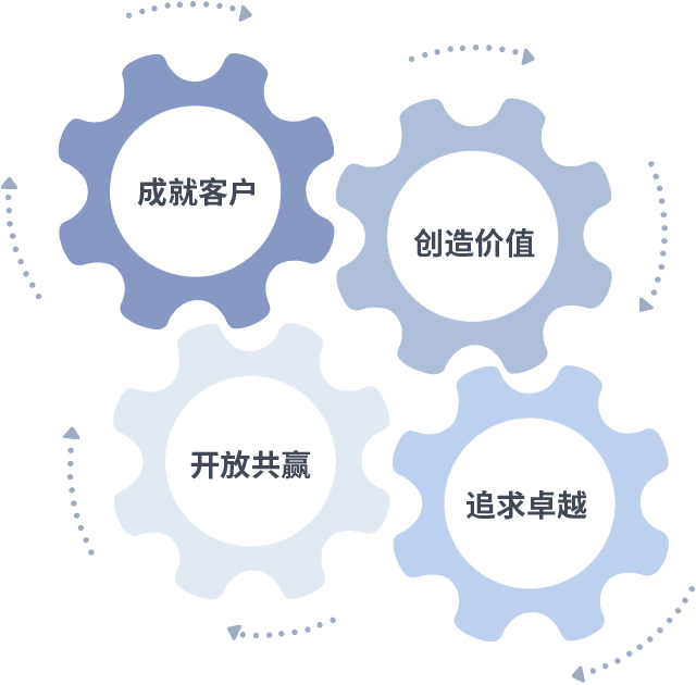成就客户是一切决策的出发点,,创造价值是衡量所有工作的标准,,,追求卓越是我们做事做人的态度,,,开放共赢是我们的格局也是最终的结果。。。。价值观的齿轮环环相扣,,推动着组织里的每个人不断向前。。。